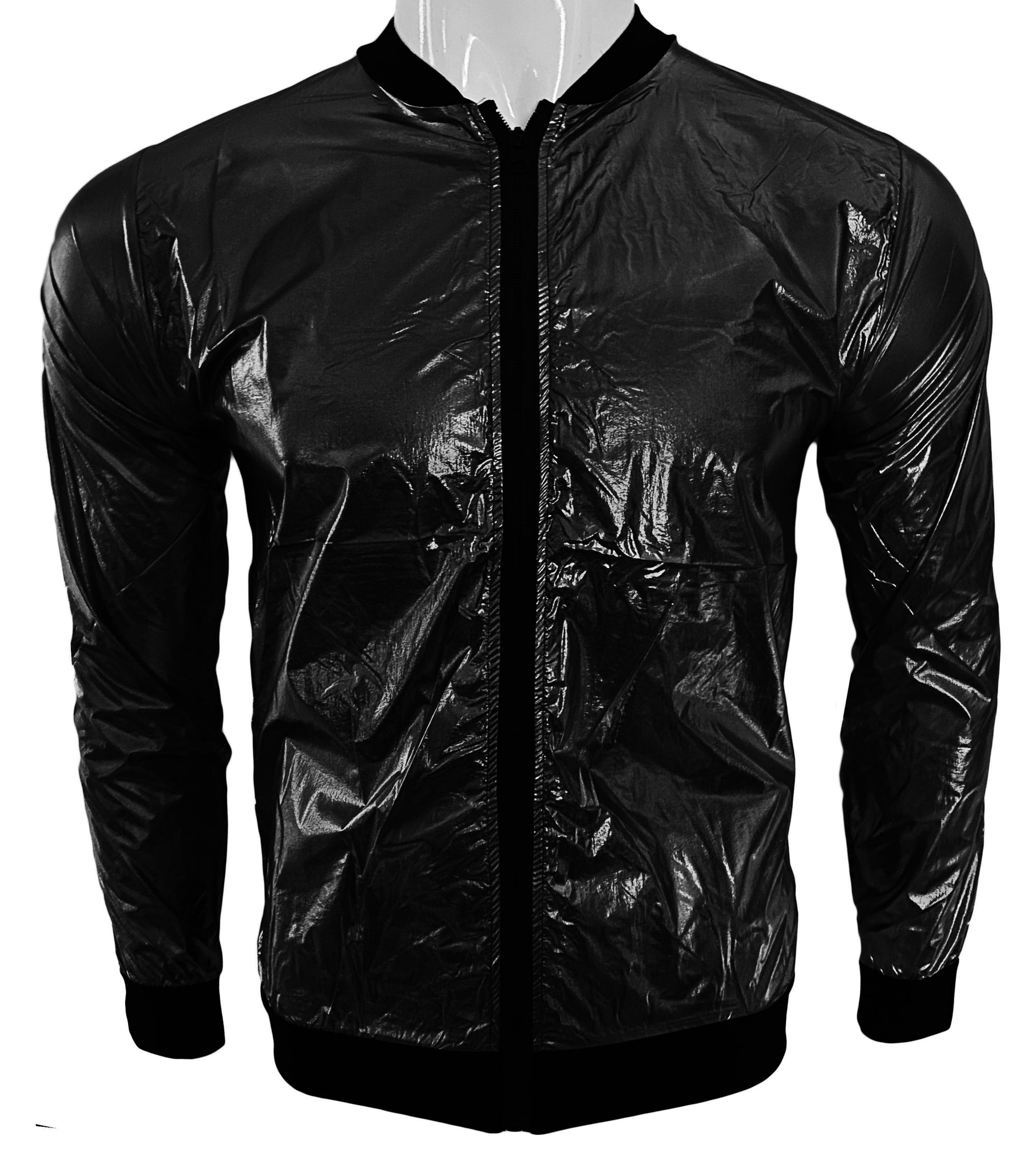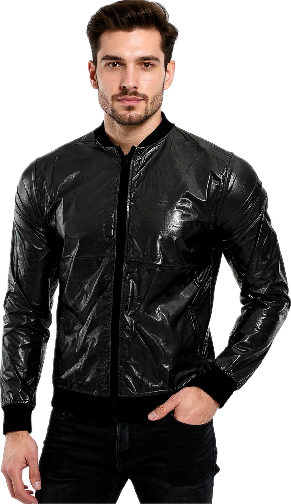 Man wearing a shiny black jacket with a zipper