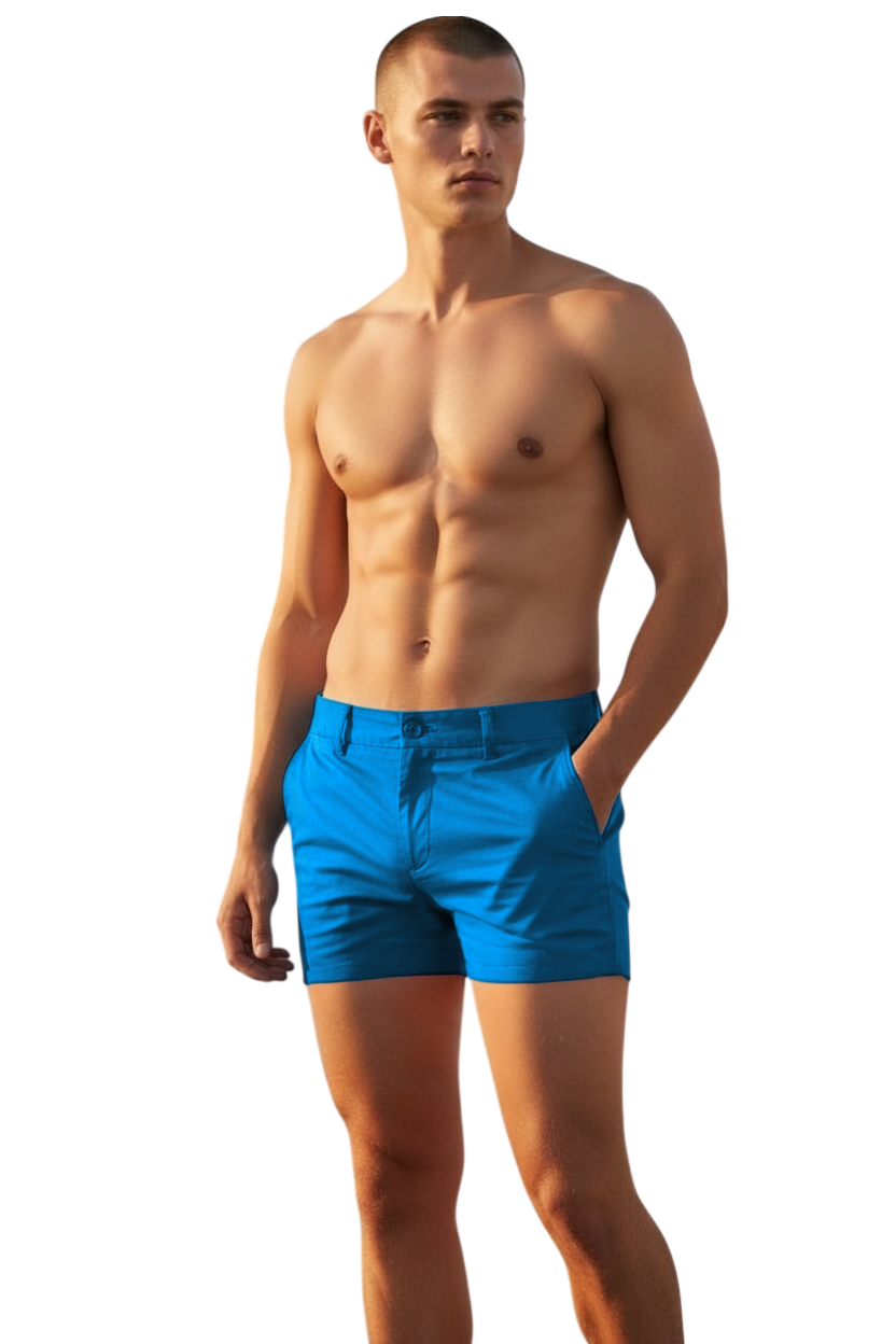 A pair of bright electric blue chino shorts with a button closure, two side pockets, and several belt loops