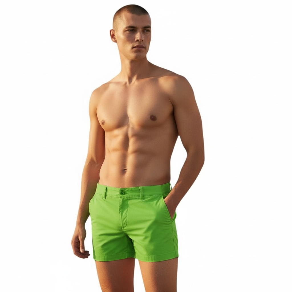 • Load image into Gallery viewer, Lime green chino shorts worn by a shirtless model