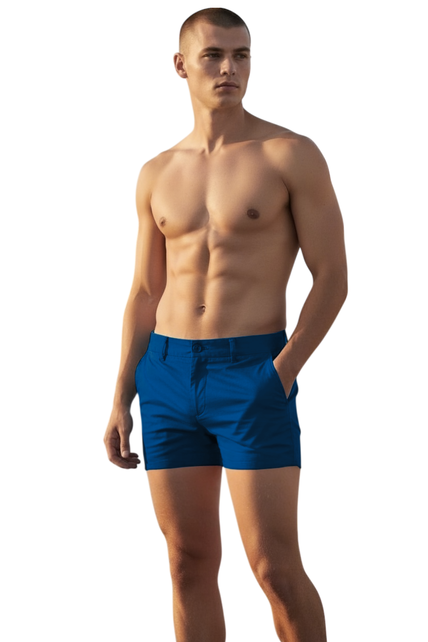 Navy chino shorts worn by a shirtless model