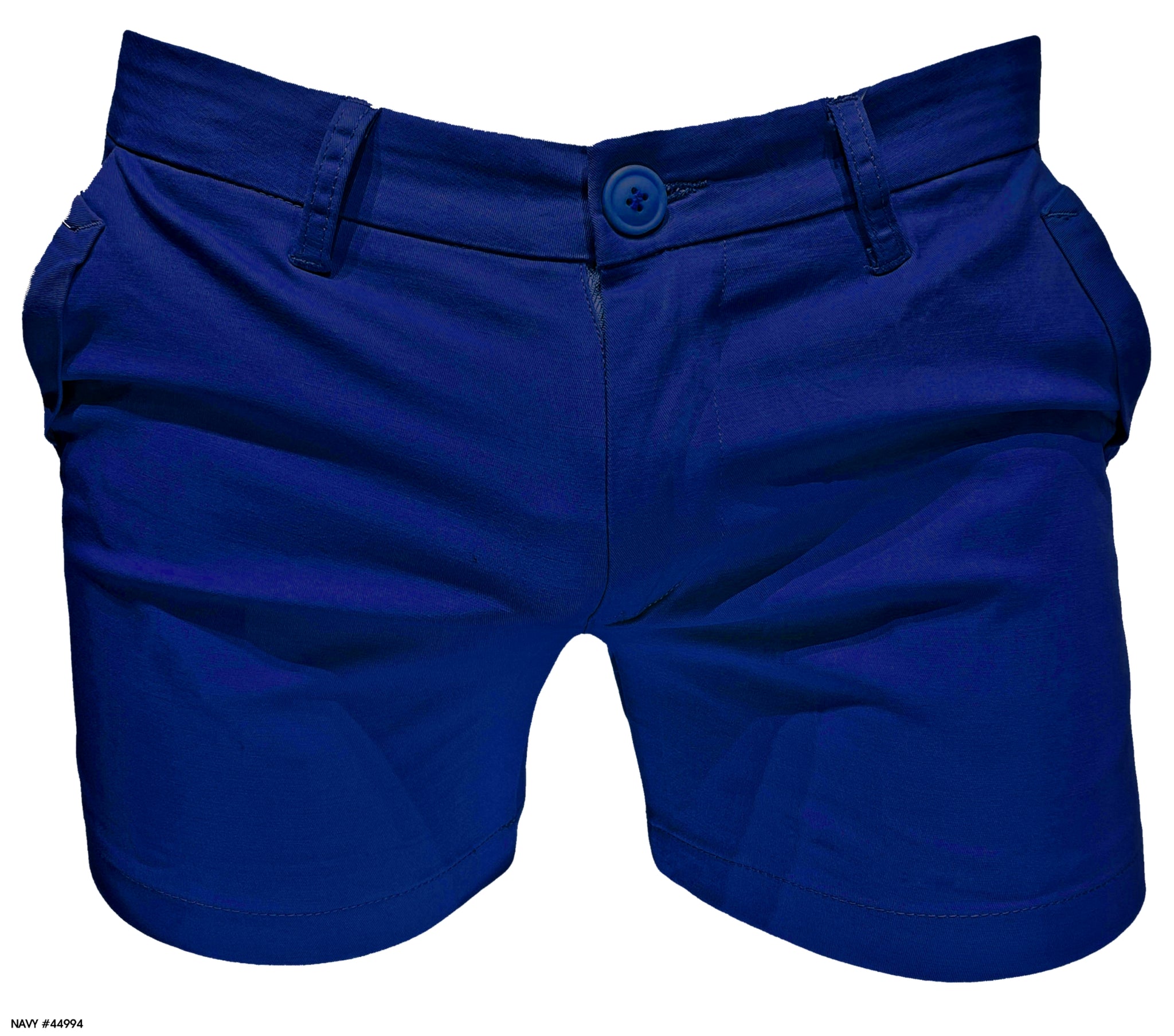 Navy blue chino shorts with button closure, belt loops, and side pockets.