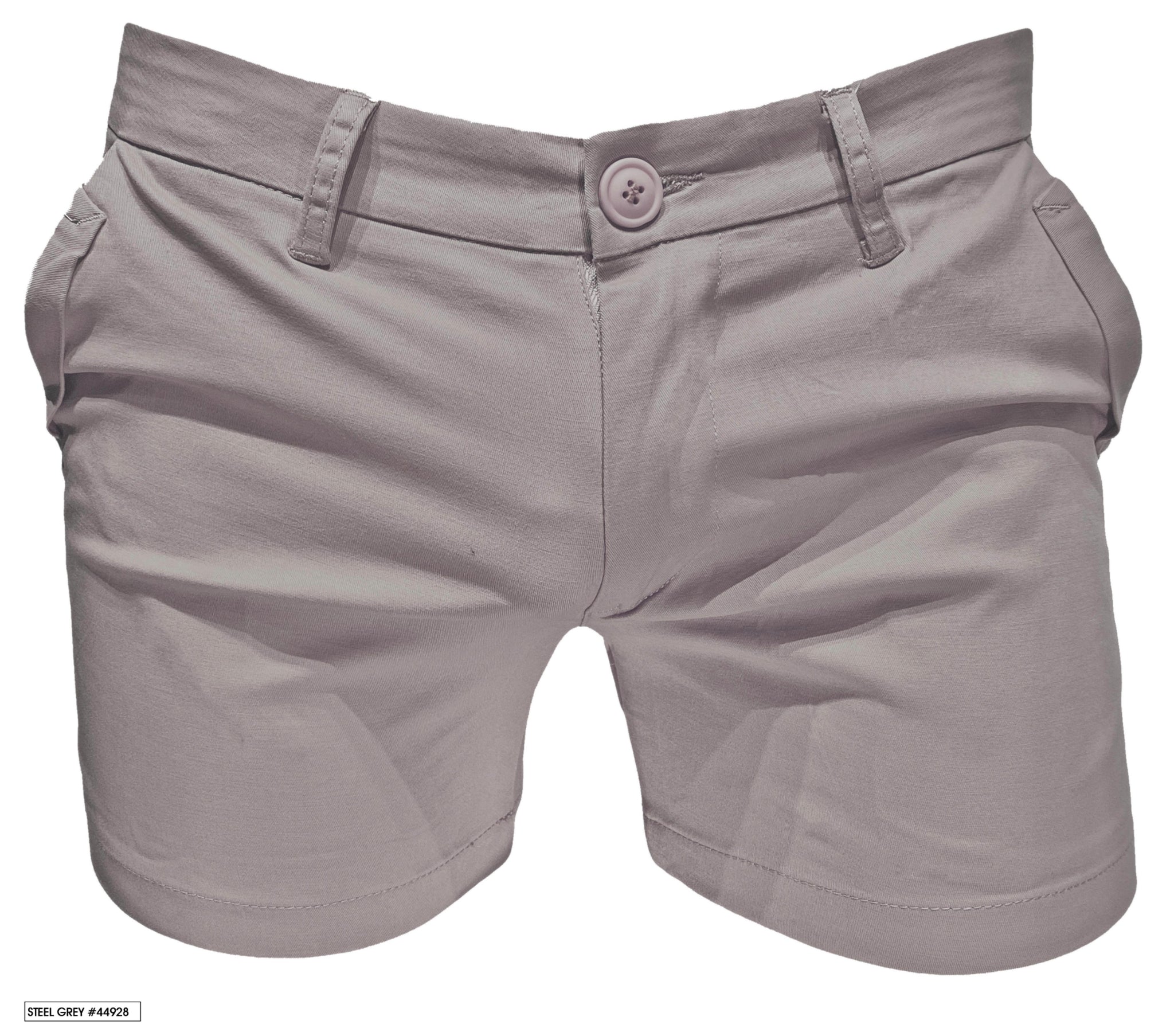 A pair of steel grey chino shorts with button closure, side pockets, and belt loops