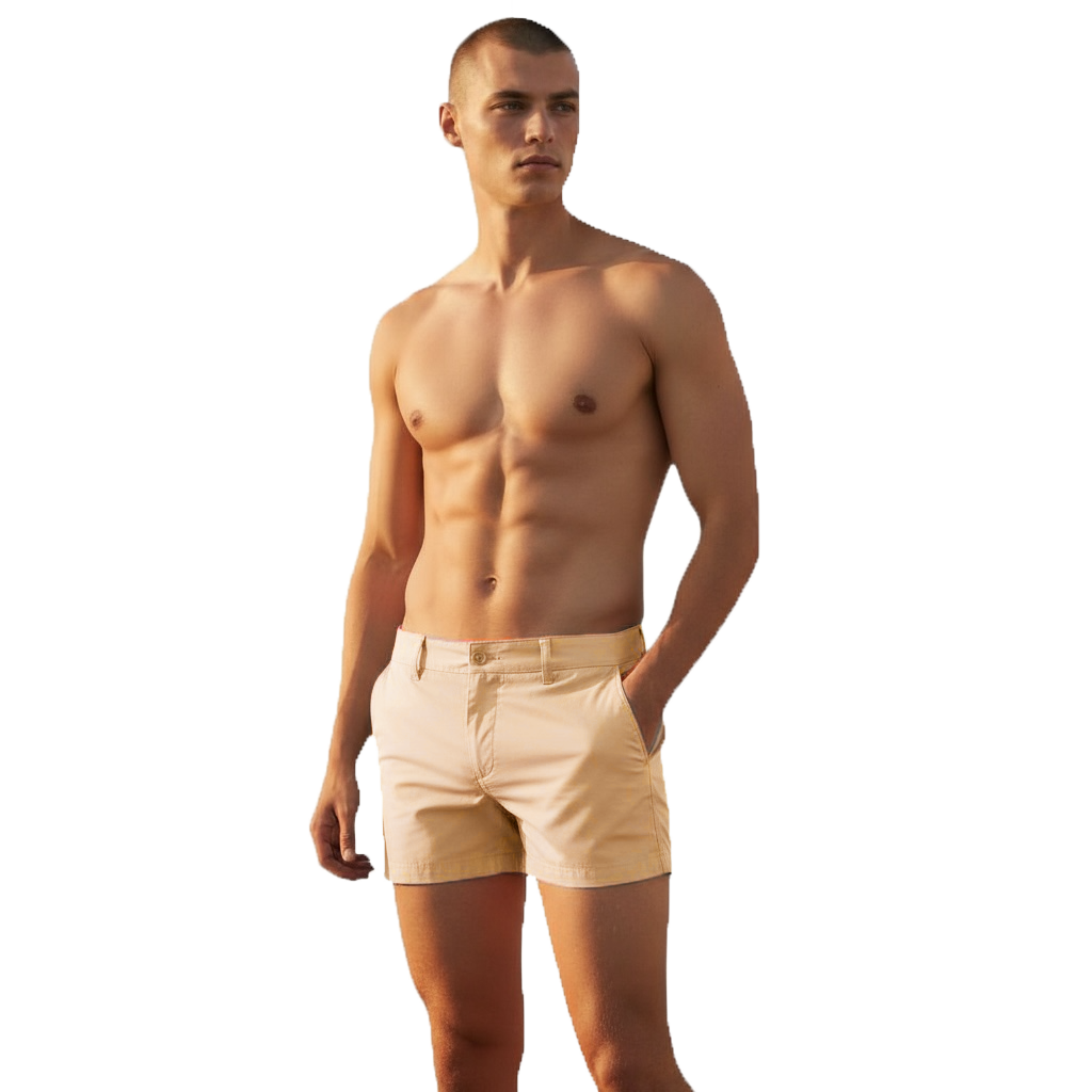 Tan chino shorts worn by a shirtless model